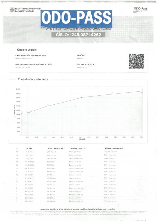 Vozidlo dovezené zo zahraničia v roku 2012. Ku vozidlu je vystavený výpis zo štátneho Registra prevádzkových záznamov vozidiel - ODO-PASS, ktorý zobrazuje históriu najazdených kilometrov vozidla. Posledná servisná prehliadka: 01/2026 pri 209 660 km - výmena oleja a filtrov, 1/2026 menené ľavé predné rameno. Obuté zimné pneumatiky na hliníkových diskoch 225/65 R17, v cene vozidla aj letné pneumatiky na hliníkových diskoch 225/65 R17. Cena prispôsobená technickému a optickému stavu vozidla. AUTOALLES: najväčší slovenský autobazár, už od roku 1990, doživotná záruka na pôvod vozidla s garanciou vrátenia peňazí. Tešíme sa na vašu návštevu.